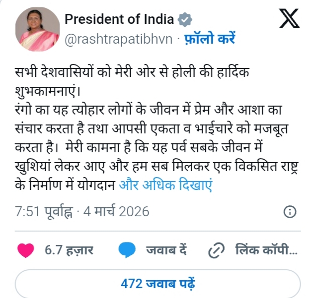 उधर प्रधानमंत्री नरेंद्र मोदी ने देशवासियों को होली की शुभकामनायें देते हुए एक्स पर लिखा है , ‘होली का त्योहार पूरे माहौल में नई ऊर्जा भर देता है. यही इस उत्सव की बड़ी विशेषता है, हर तरफ जिस प्रकार खुशियों के रंग बिखरे नजर आते हैं, वो हर किसी को उल्लास और आनंद से सराबोर कर जाता है।